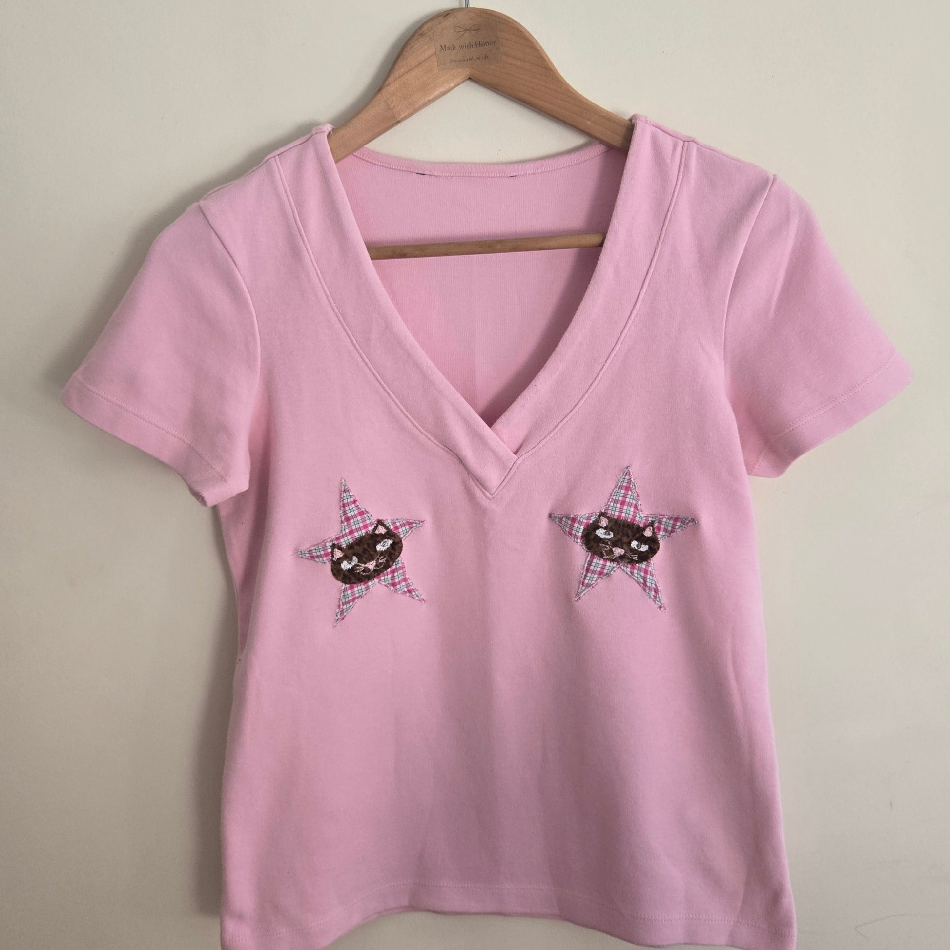 Baby pink v neck t-shirt with embroidered cats and stars.