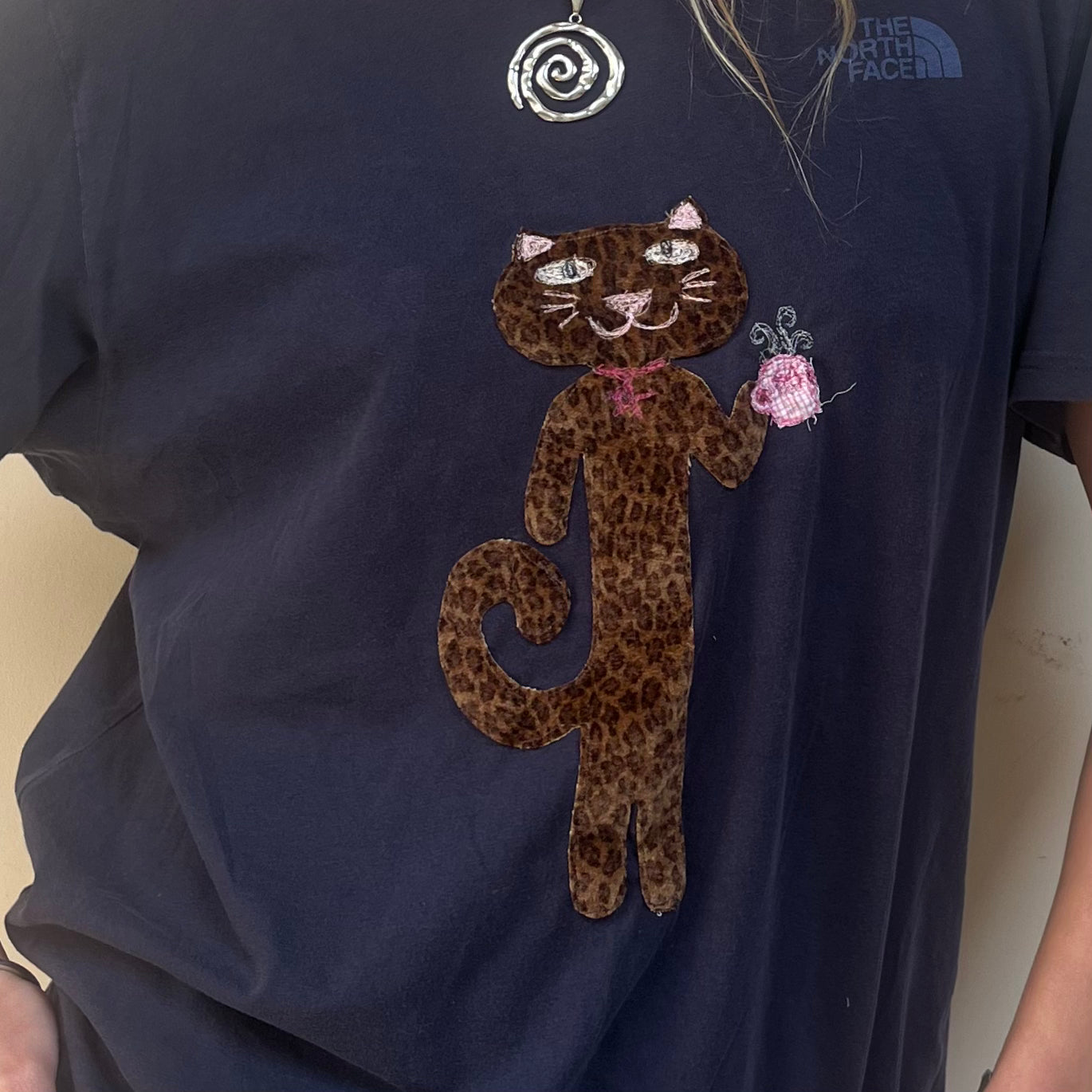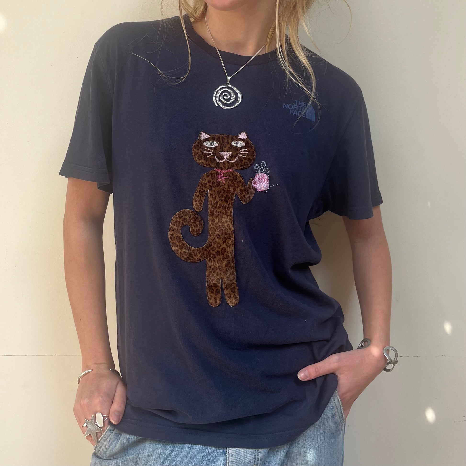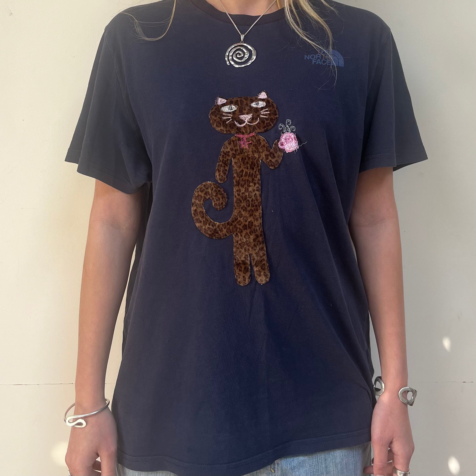 Leopard print cat drinking tea embroidered onto navy cotton t-shirt.