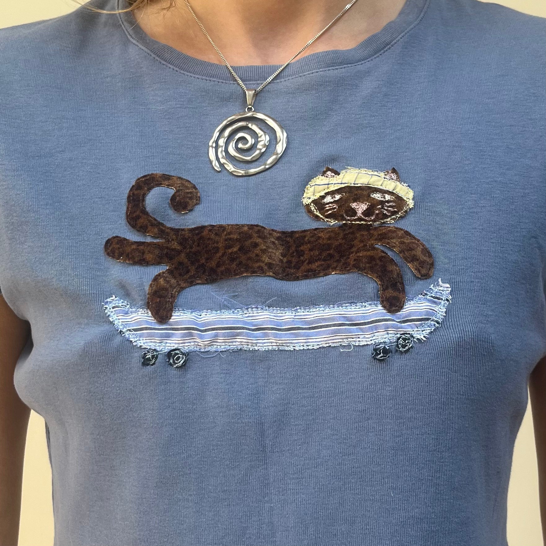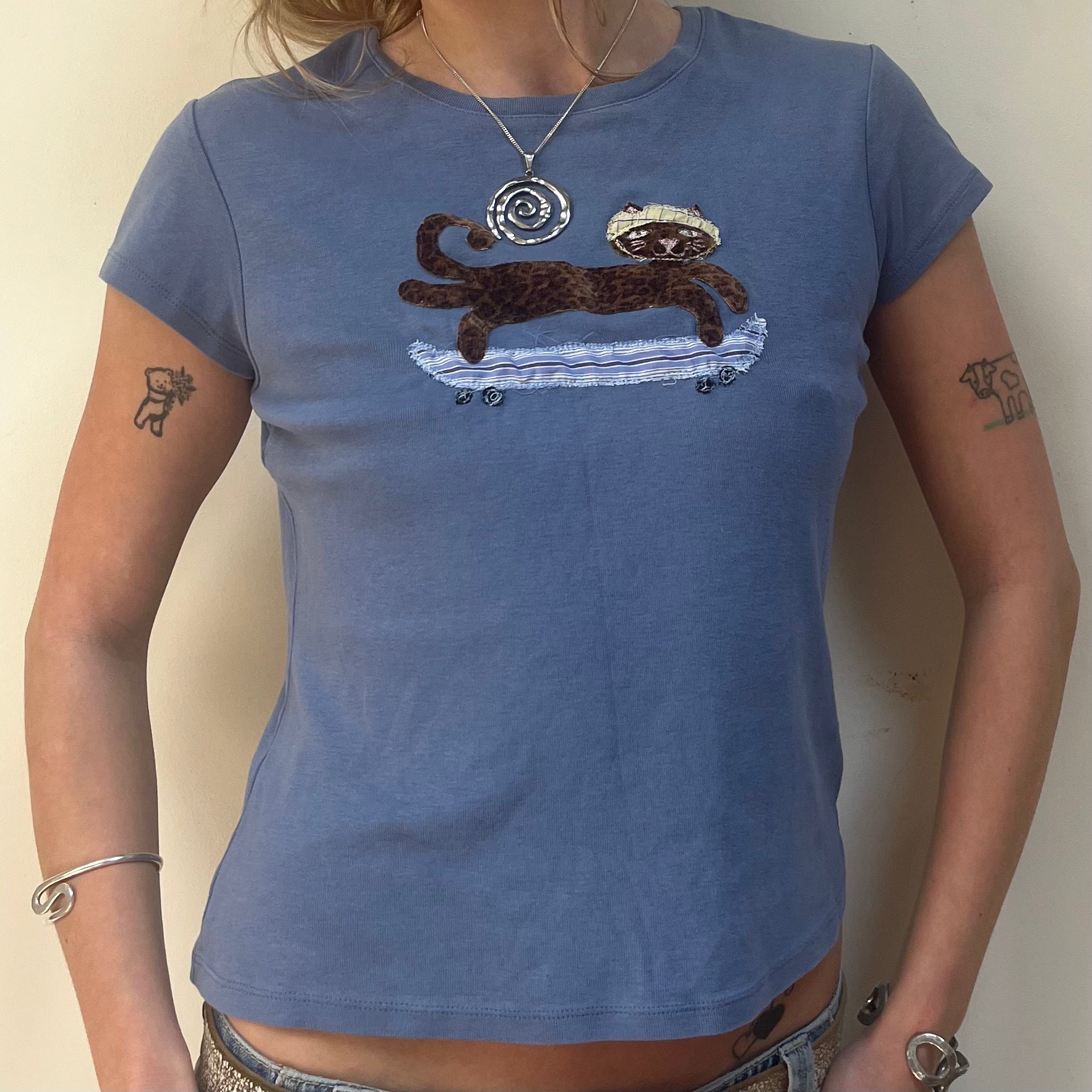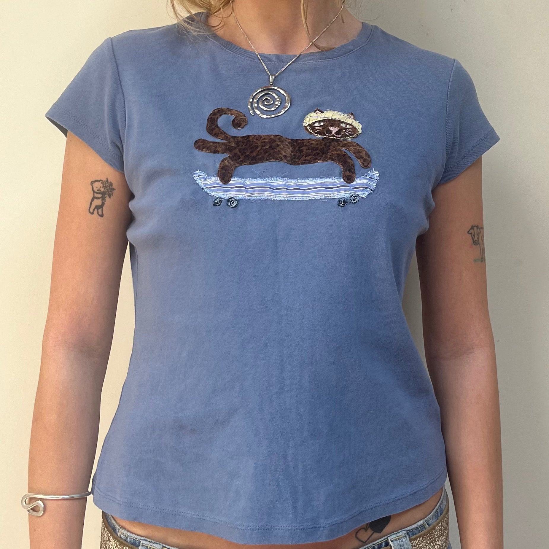 Skateboarding leopard print cat embodied on blue cotton t-shirt