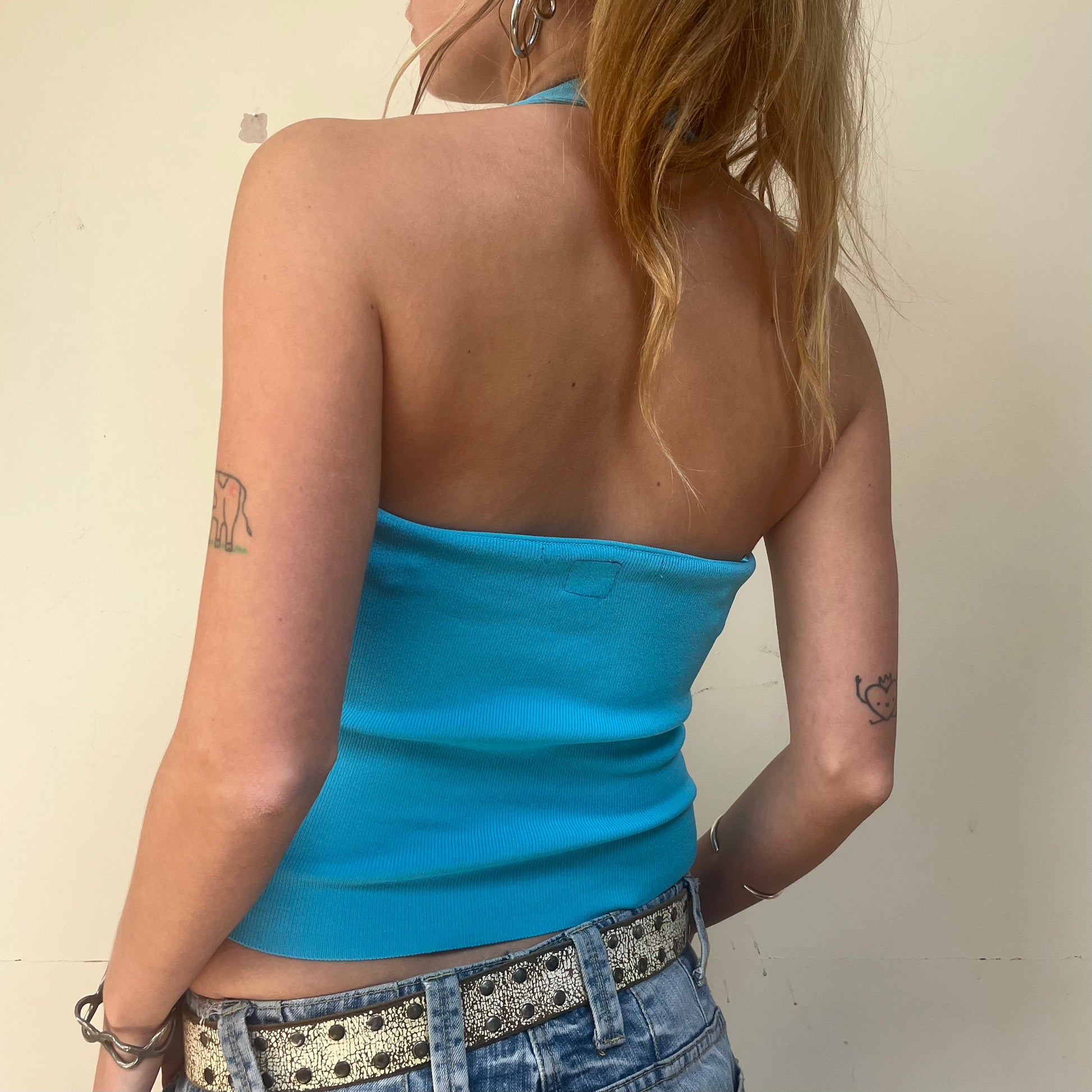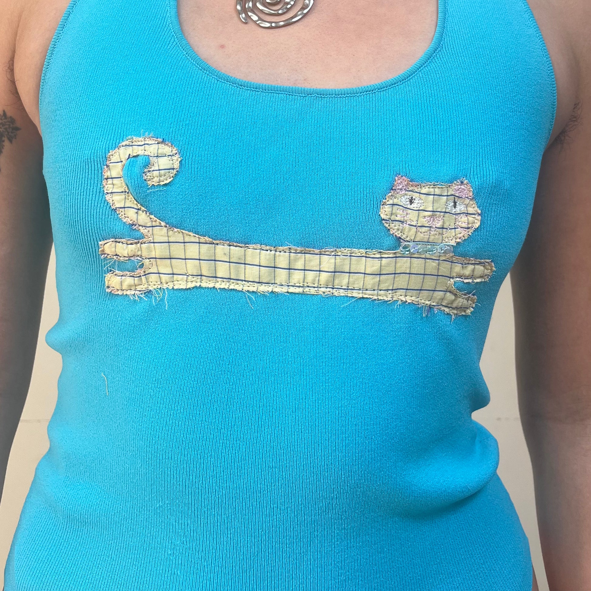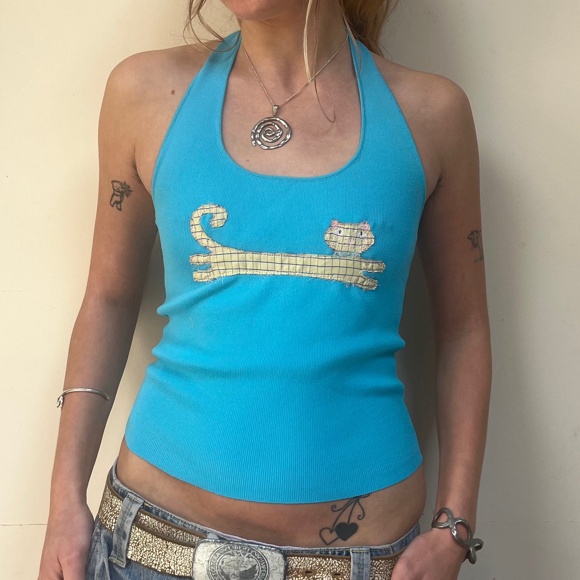 Yellow cat embroidered onto bright blue halter neck top.